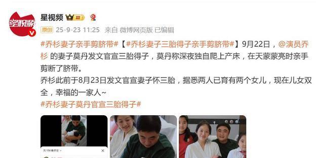 9月22日,演员乔杉的妻子莫丹在社交平台官宣三胎得子,一句“深夜独自爬上产床,在天蒙蒙亮时亲手剪断了脐带”,瞬间让这条喜讯多了几分坚韧与感动。她还称这是孩子带给她的“出生礼”,让她“更勇敢、更圆满”。